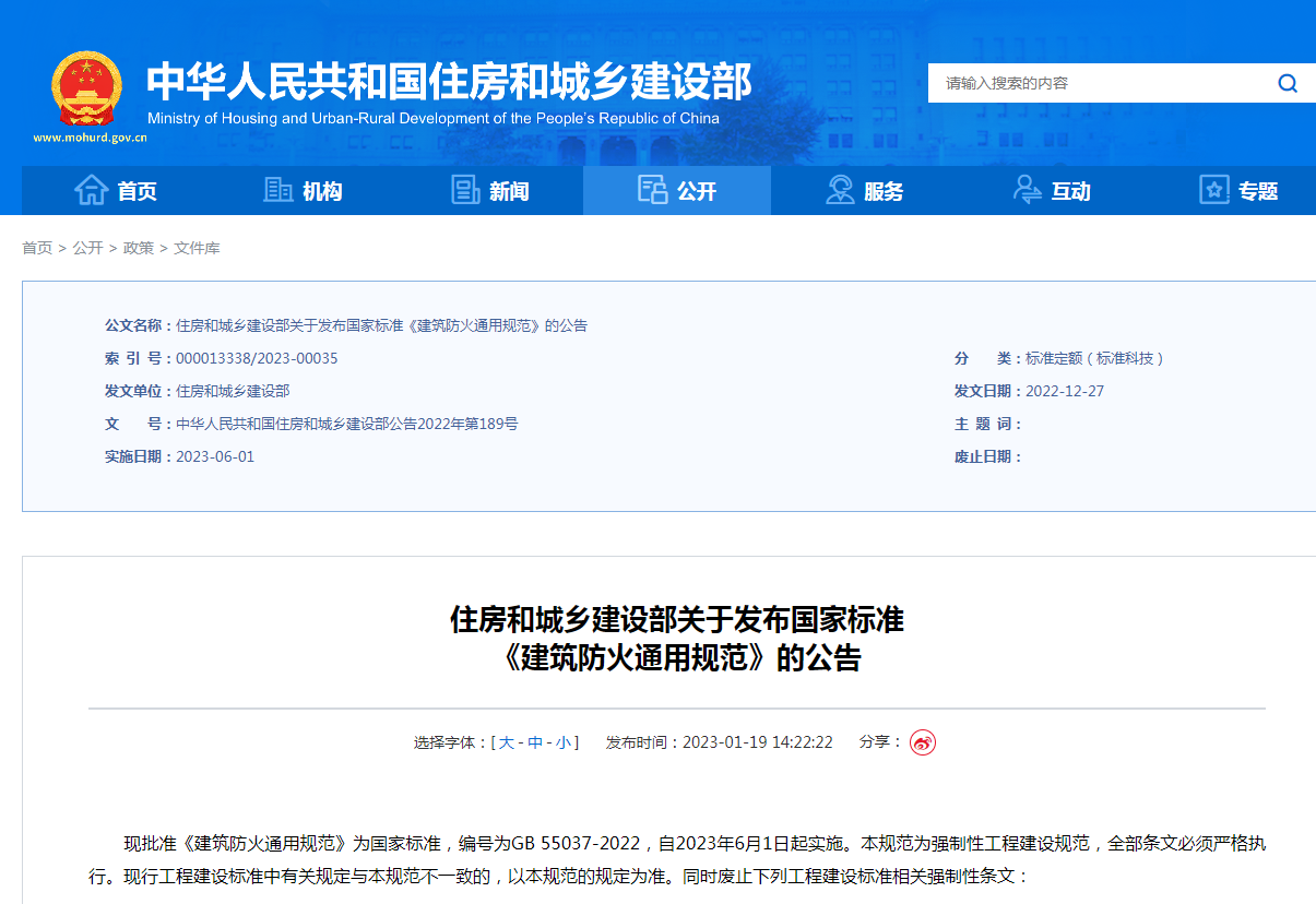 現批準《建筑防火通用規范》為國家標準,編號為GB 55037-2022,自2023年6月1日起實施。本規范為強制性工程建設規范,全部條文必須嚴格執行。現行工程建設標準中有關規定與本規范不一致的,以本規范的規定為準。同時廢止下列工程建設標準相關強制性條文: