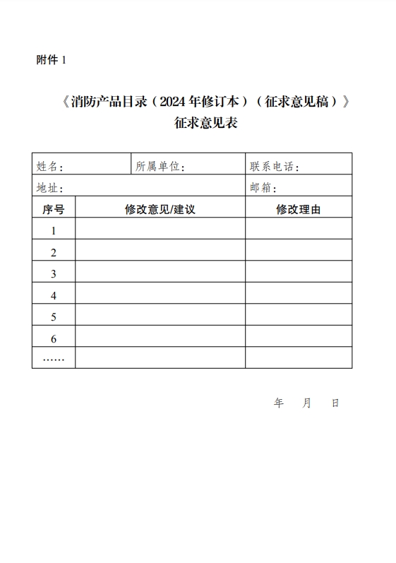 1.《消防產品目錄(2024年修訂本)(征求意見稿)》征求意見表