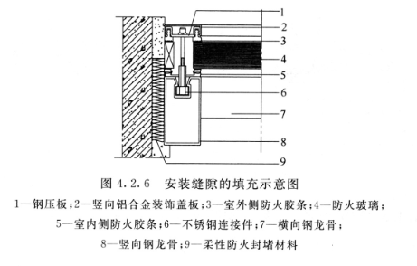 4.2.6 框架系統(tǒng)與主體結(jié)構(gòu)間的安裝縫隙,應(yīng)采用柔性不燃材料填充(圖4.2.6)。