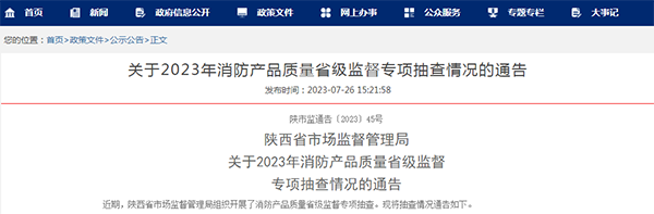 中國質量新聞網訊 2023年7月26日,陜西省市場監督管理局網站發布關于2023年消防產品質量省級監督專項抽查情況的通告。具體抽查情況如下。