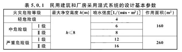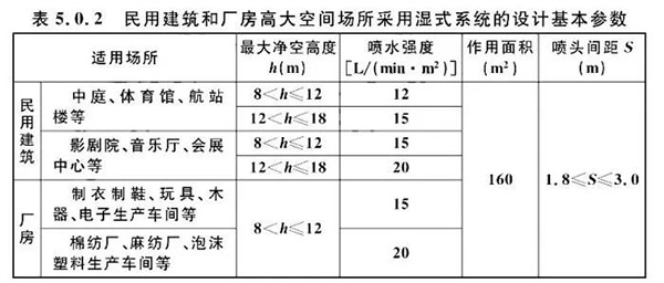 答:是的,表5.0.1、表5.0.2分別規定了h≤8m、8m<h≤18m濕式系統的參數,《自動噴水滅火系統設計規范》GB 50084第5.0.10條、第5.0.11條規定干式系統、預作用系統的參數時引用了表5.0.1,未引用表5.0.2,故干式系統、預作用系統僅針對不超過8m的場所。