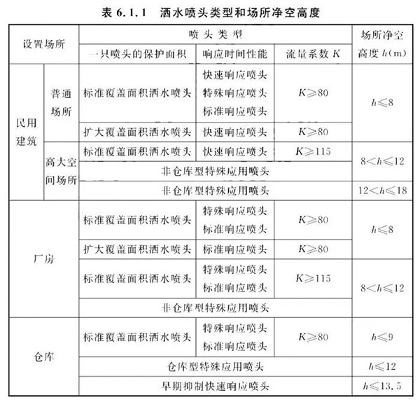 6.1.1設置閉式系統的場所,灑水噴頭類型和場所的最大凈空高度應符合表6.1.1的規定;僅用于保護室內鋼屋架等建筑構件的灑水噴頭和設置貨架內置灑水噴頭的場所,可不受此表規定的限制。