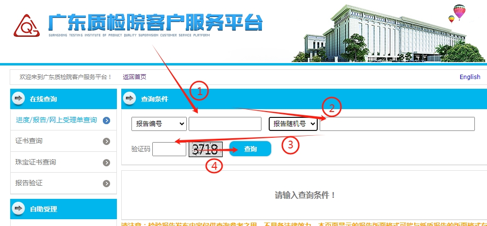 第二步:輸入①報告編號、②報告隨機號、③驗證碼 ,然后點擊④查詢即可。