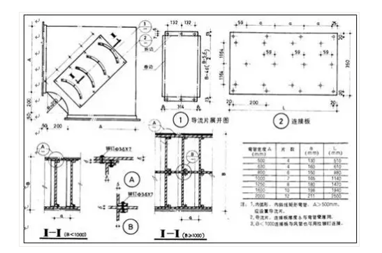 (1)空調風管長邊尺寸大于500mm直角彎頭應加導流片。導流片的弧度應與彎管角度相一致。風管轉彎半徑一般R=D。矩形短半徑彎頭應加導流葉片,導流葉片厚度為風管的兩倍,不小于60mm,片數不得少于兩片。