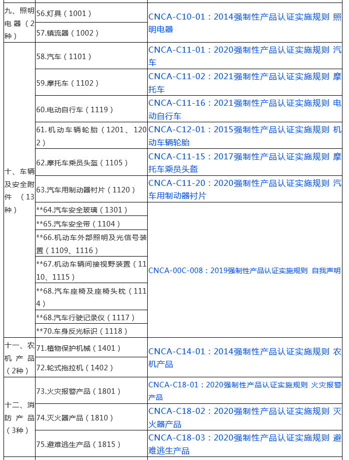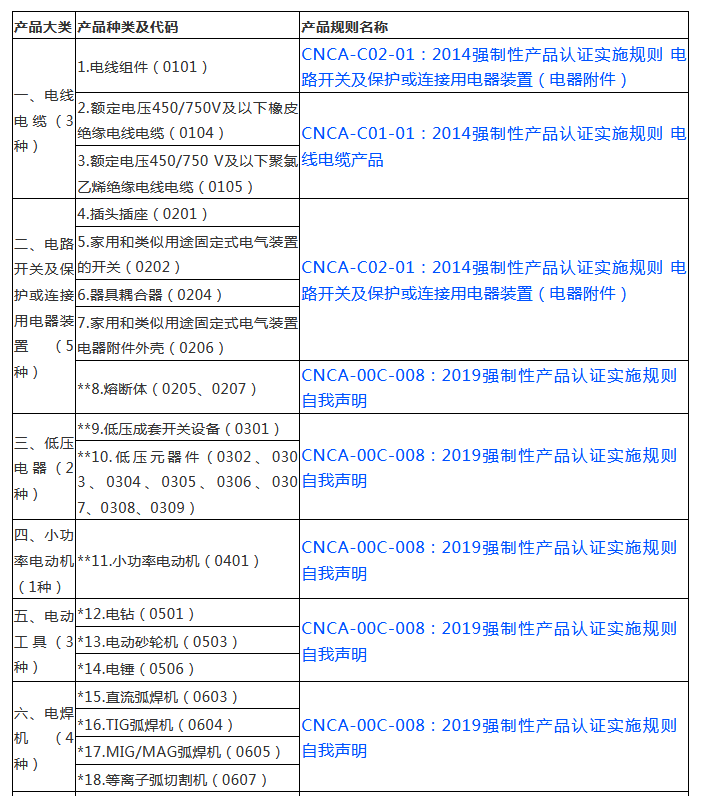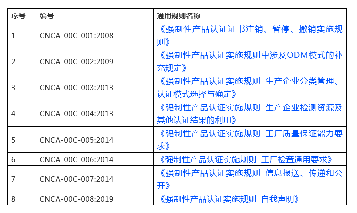 據國家認證認可監督管理委員會(CNCA)官網公布的強制性產品認證實施規則匯總,供大家參考。具體通用規則名稱和序號如下: