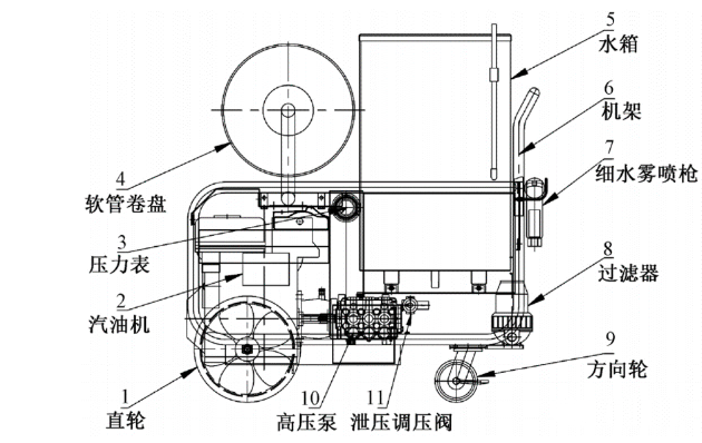 某大型室內滑雪場館設計采用移動式細水霧滅火裝置,選用細水霧-水霧噴嘴聯用、汽油機泵組供液方式的推車式細水霧滅火裝置,其由汽油機、高壓泵、泄壓調壓閥、過濾器、水箱、卷盤、細水霧噴槍、壓力表、機架及進水管等組成。細水霧槍通過汽油機帶動高壓泵產生壓力水,通過調整細水霧噴槍,無需更換噴嘴即可實現水霧和細水霧兩種噴射模式。推車式細水霧滅火裝置的結構和外形分別見圖2和圖3。考慮到冷區低溫環境的影響,將推車式細水霧滅火裝置設置在保溫墻外的暖區且靠近冷區的部位避免結凍,發生火災時可由現場滅火人員或消防隊員利用人力將其推至火災現場啟動進行滅火。