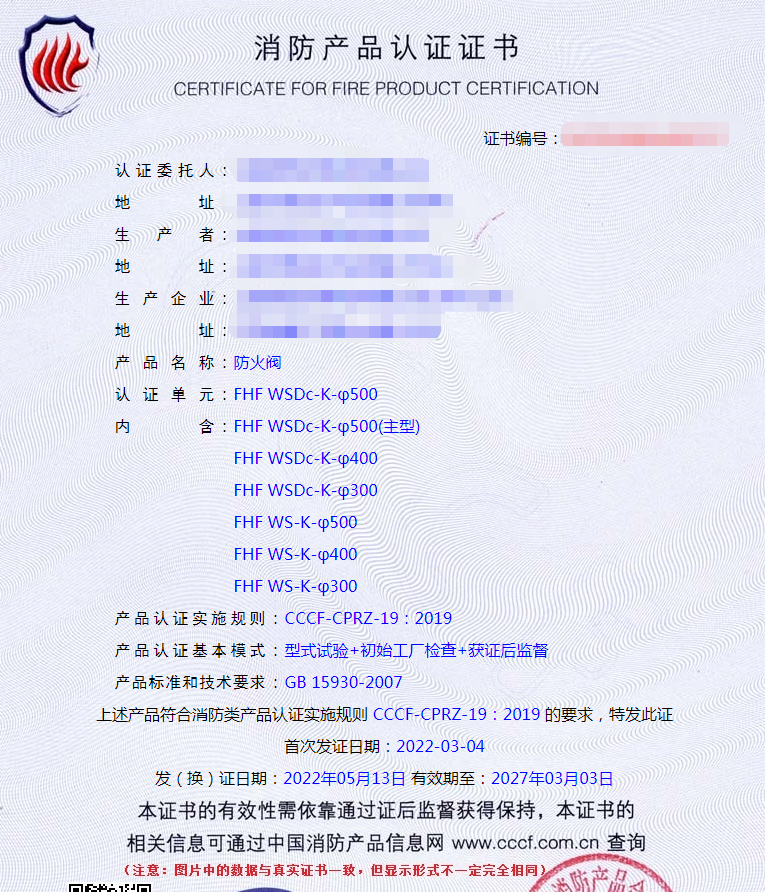 防火閥3C認證,產品標準和技術要求:GB 15930-2007 ,產品認證實施規則:CCCF-CPRZ-19:2019 。其認證證書樣式如下圖(證書有效期5年,到期后另再延續):