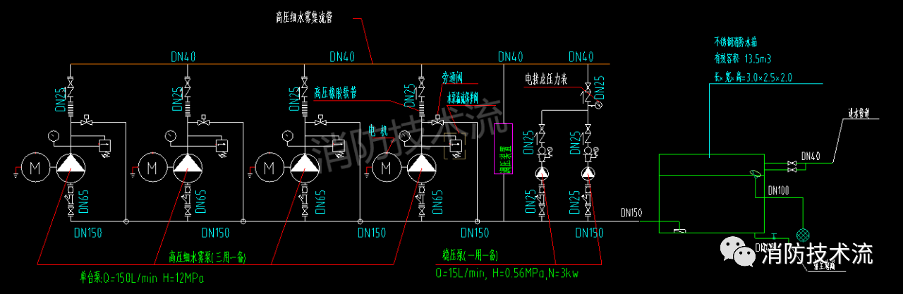 6、細水霧滅火介質采用淡水,系統用水量為1.5t,設置有效容積為13.5m?儲水箱,水箱材質采用不銹鋼,儲水箱的出水口高于水泵的入水口(即水箱出水口對水泵入水口保持正壓)