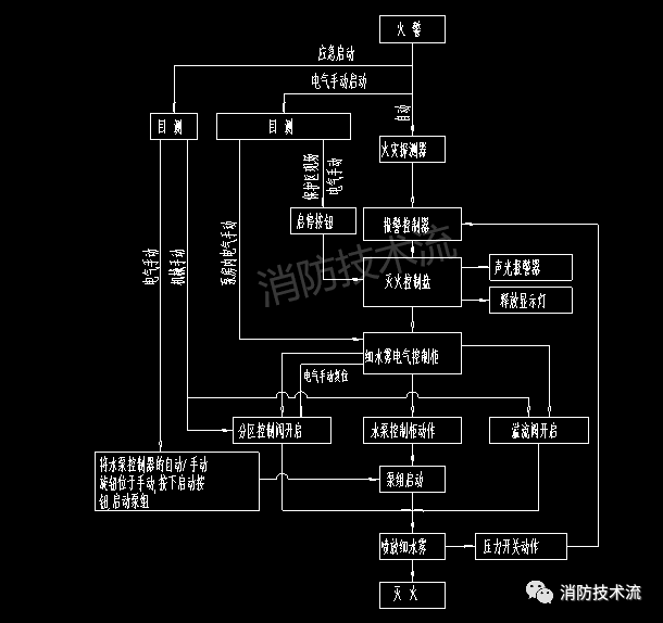 ?。?)自動控制:防護區內一路探測器報警后,滅火控制器發出聲光警報信號,當兩路探測器報警確認火災后,滅火控制器驅動防護區內外的聲光警報器,經30s延時發出滅火指令至細水霧裝置控制柜打開對應區域的分區控制閥,并發出啟泵信號至水泵控制柜,啟動系統實施滅火。壓力開關動作后,反饋動作信號滅火控制器聯動點亮防護區入口處的噴放指示燈。開式系統的響應時間不應大于45s。